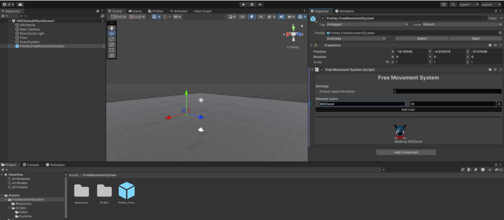 1. Drag and Drop: Place the FreeMovement prefab into your VRChat world scene in Unity.